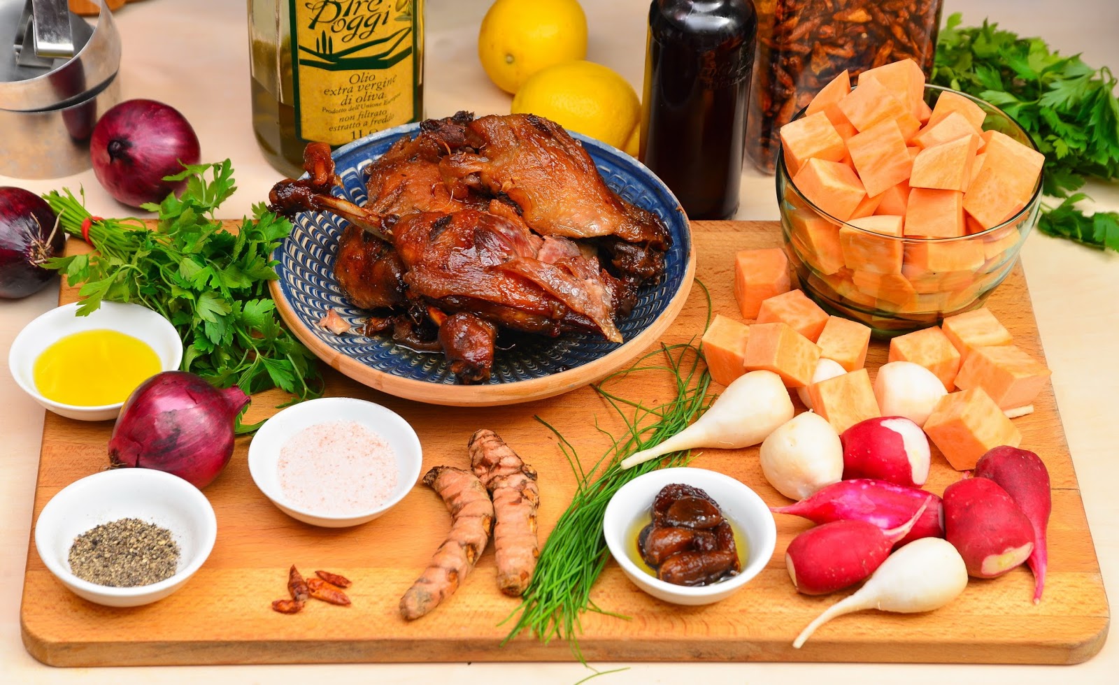 Se confiaza pulpele de rata dupa reteta de aici. Se gatesc alaturi de pulpe cativa graunti de usturoi pentru a se folosi la piure.